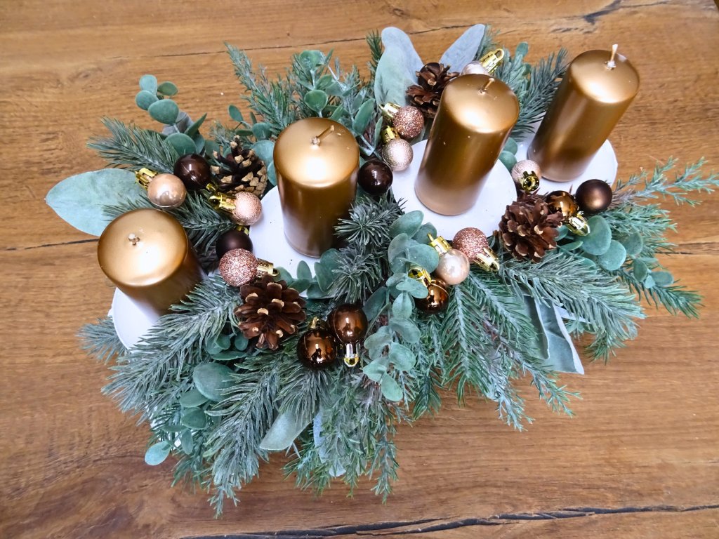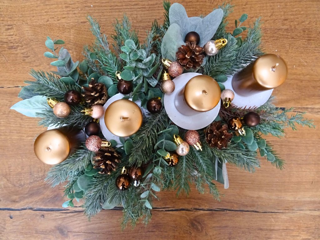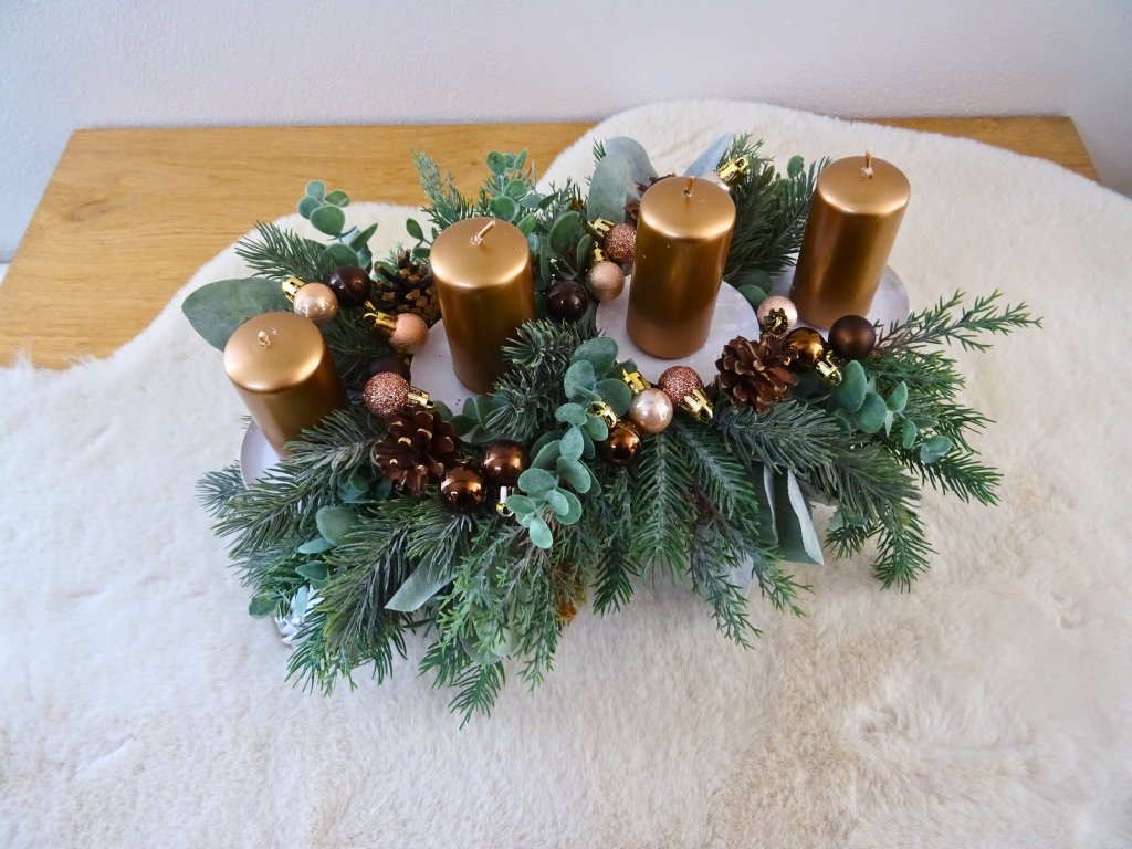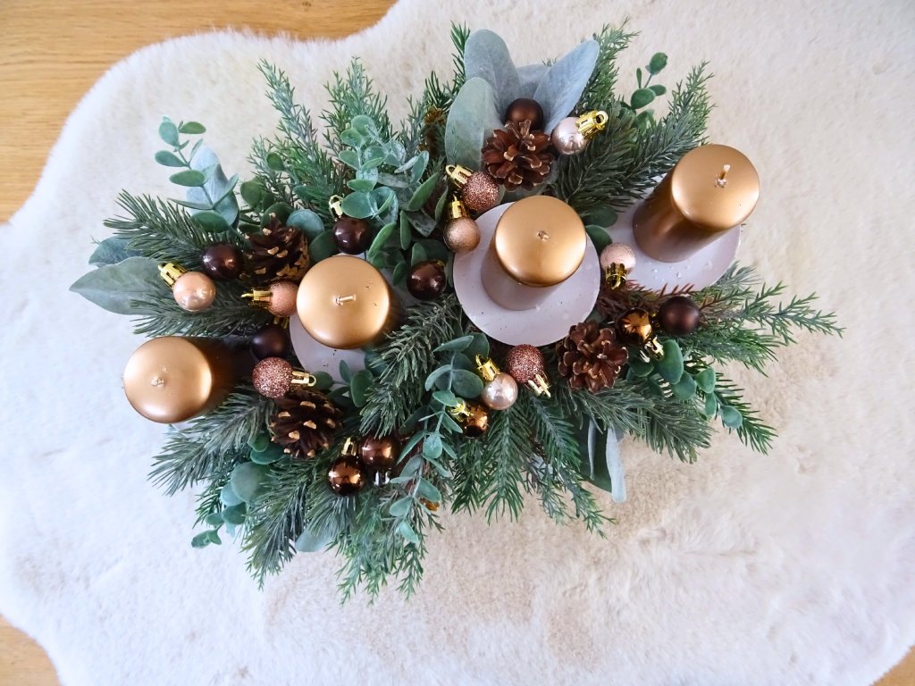 Adventní svícen na stůl se zeleným jehličím a baňkami v hnědé barvě.