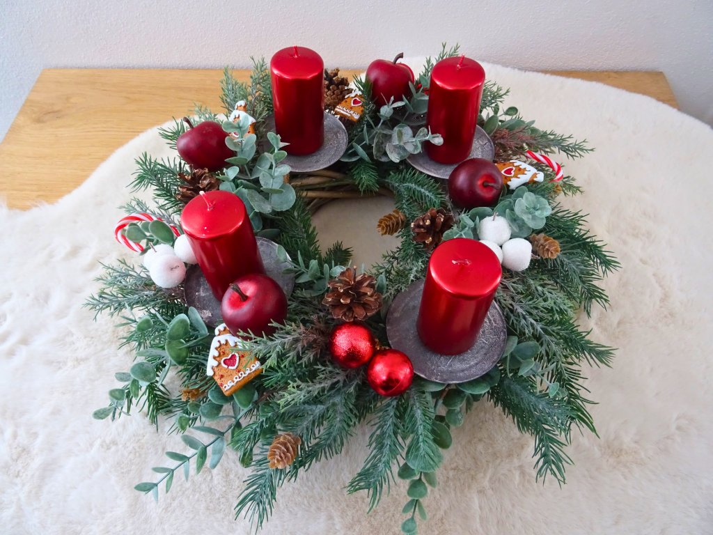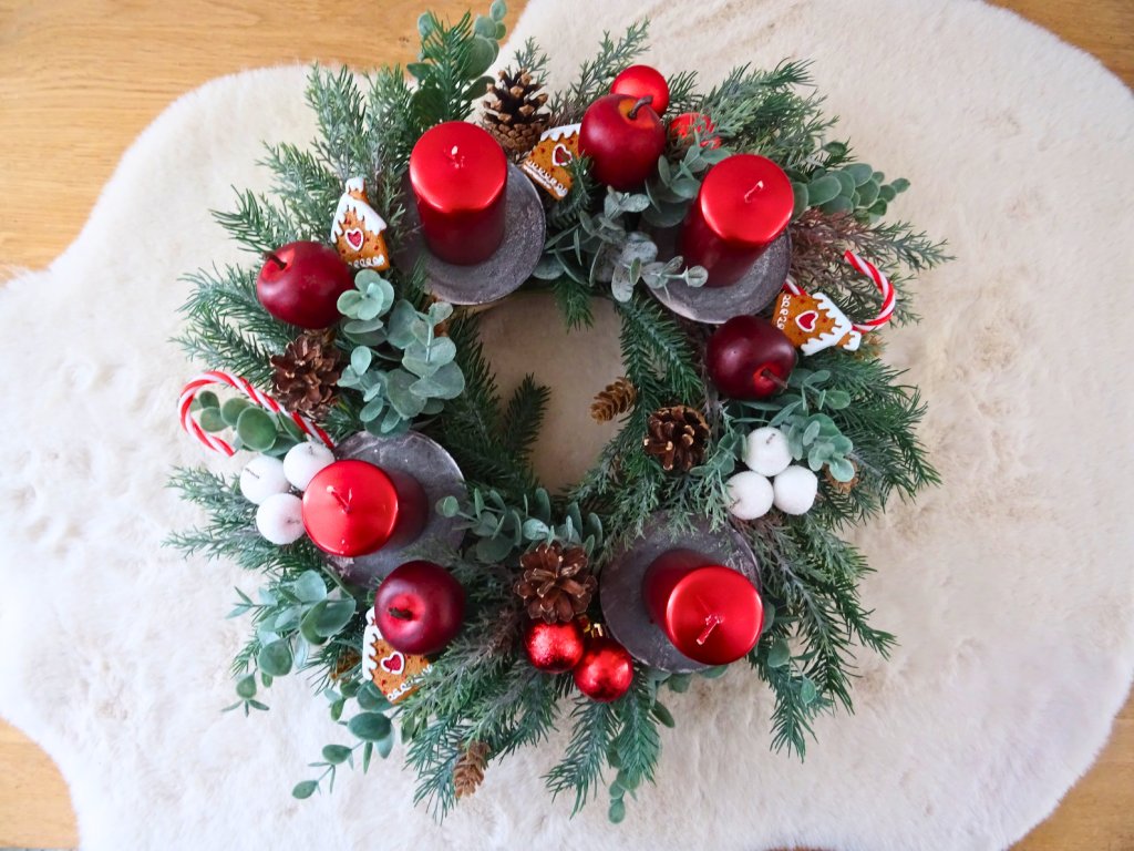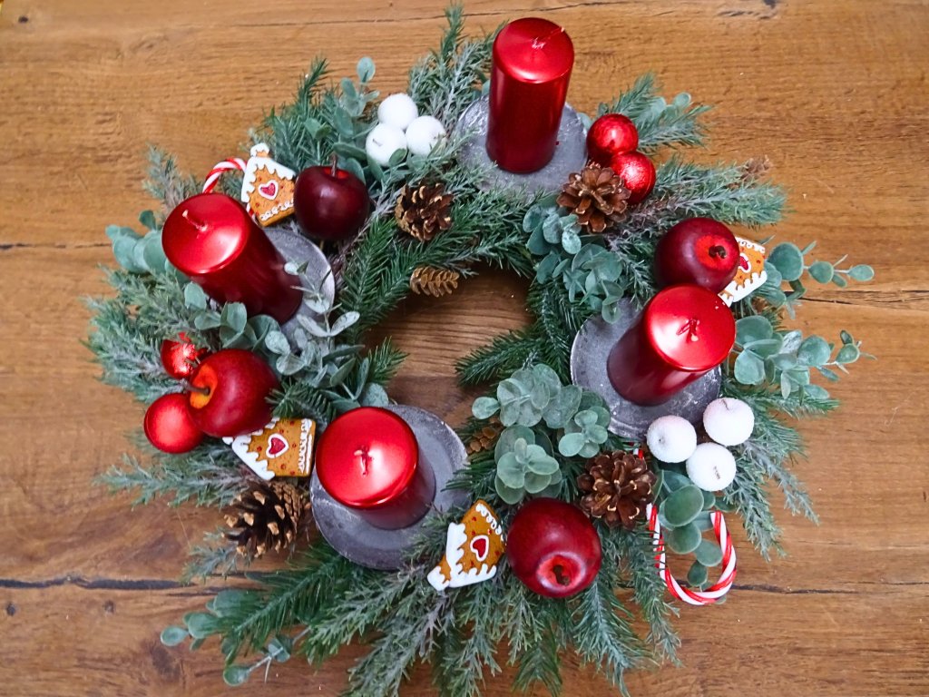 Adventní svícen na stůl se zeleným jehličím a umělými perníčky.