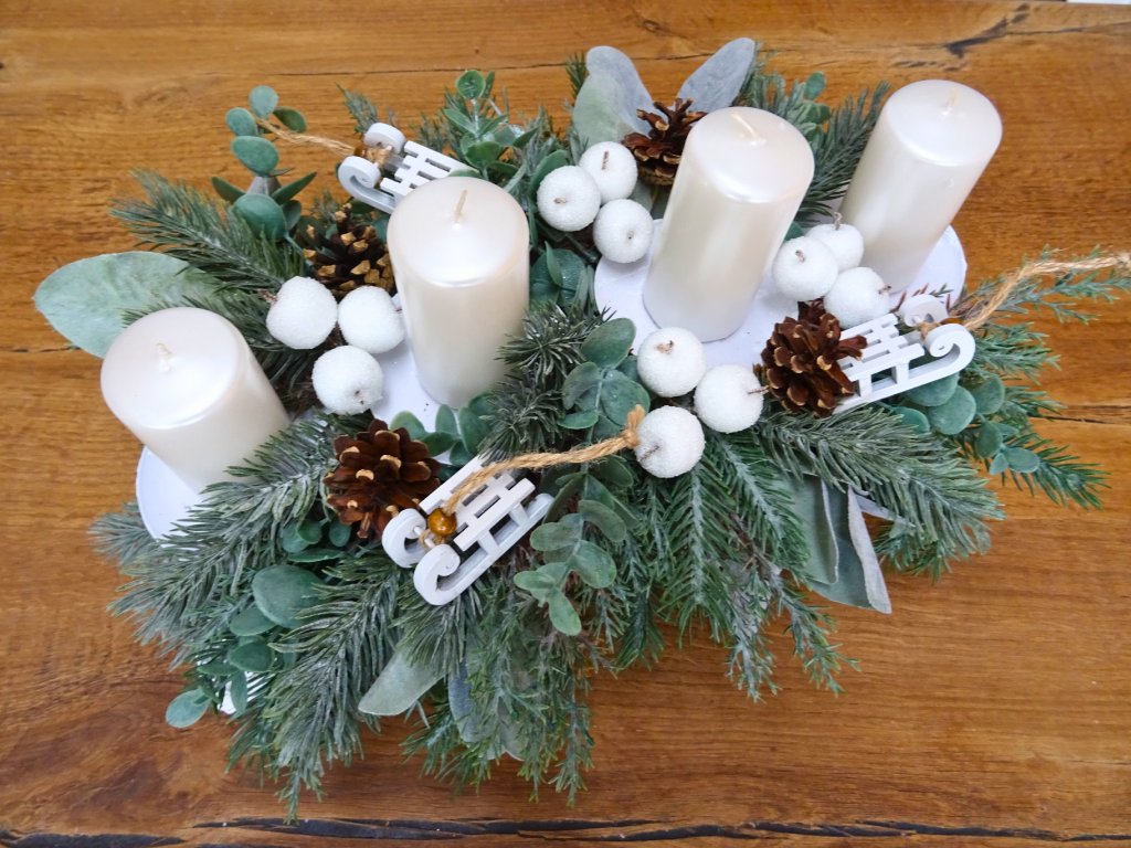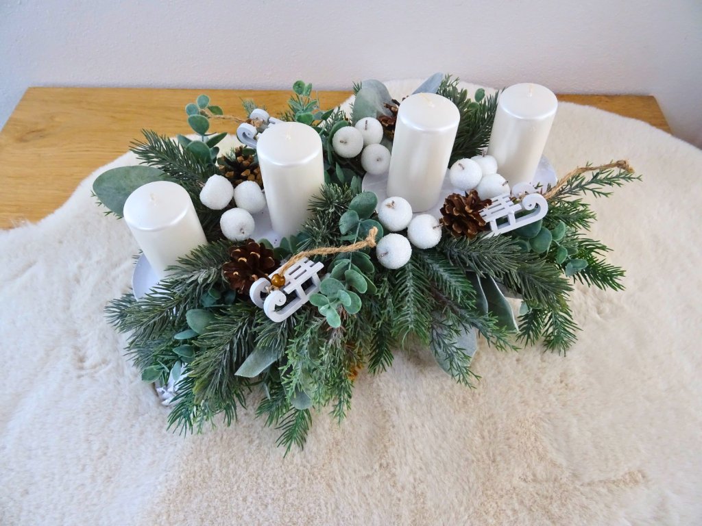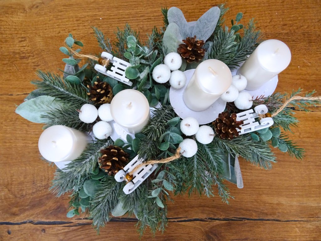 Adventní svícen na stůl se zeleným jehličím a vánočními přízdobami v bílé barvě.