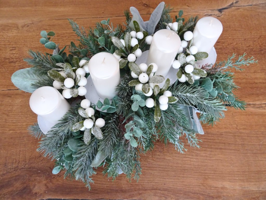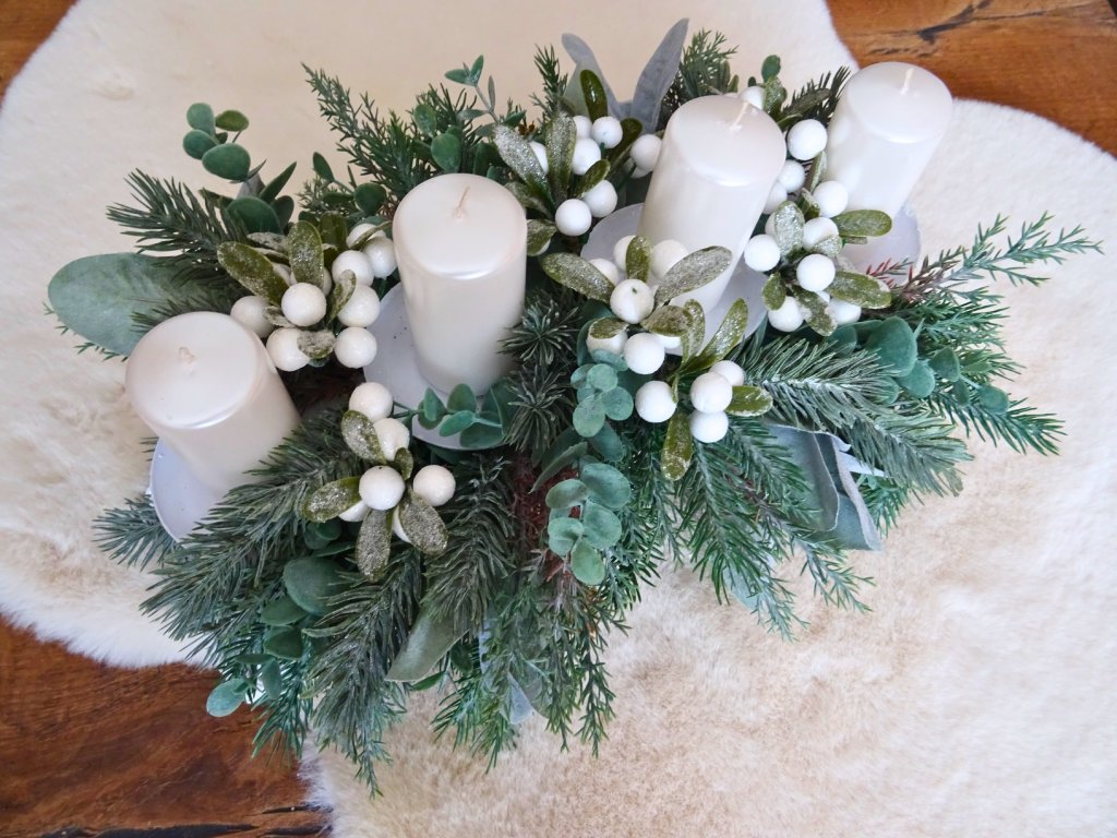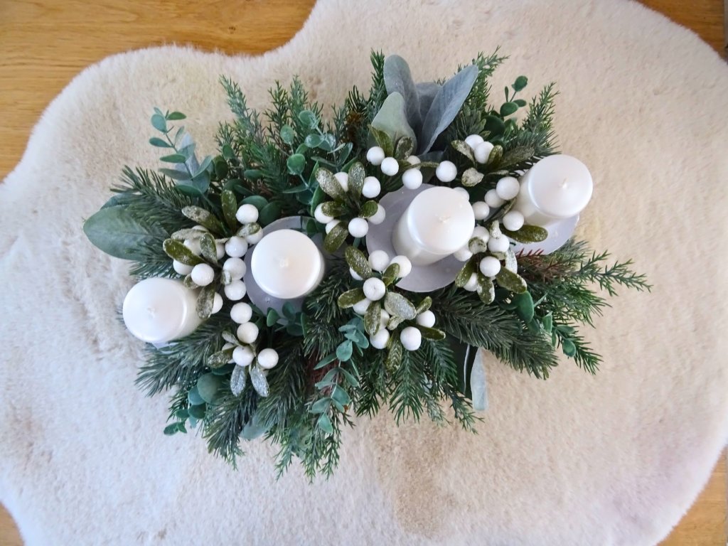 Adventní svícen na stůl se zeleným jehličím a jmelím.