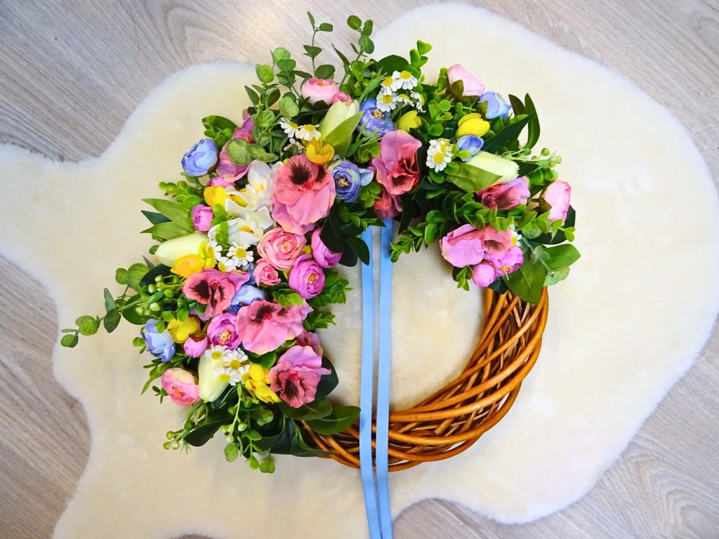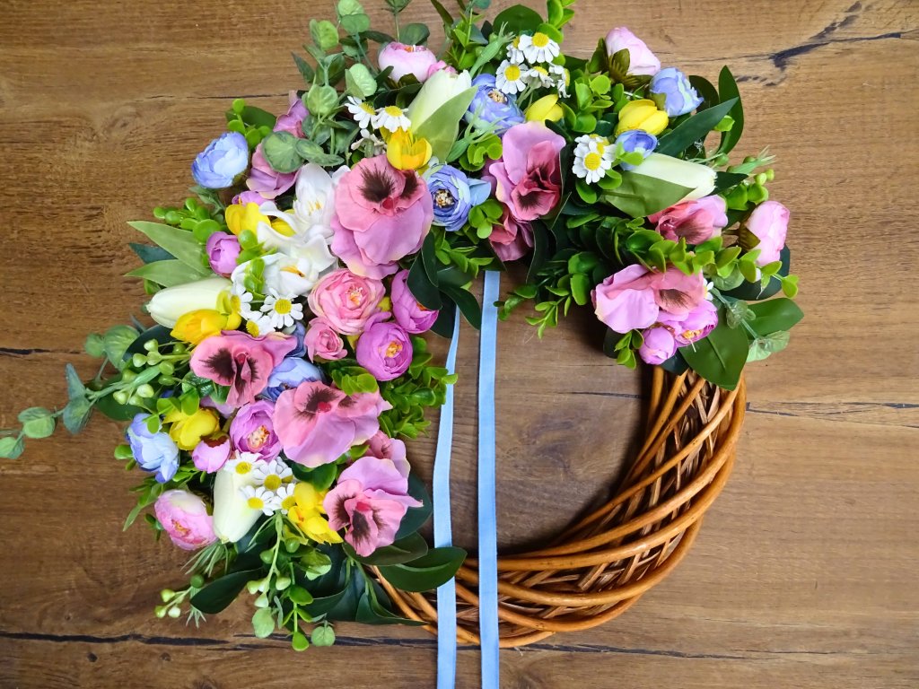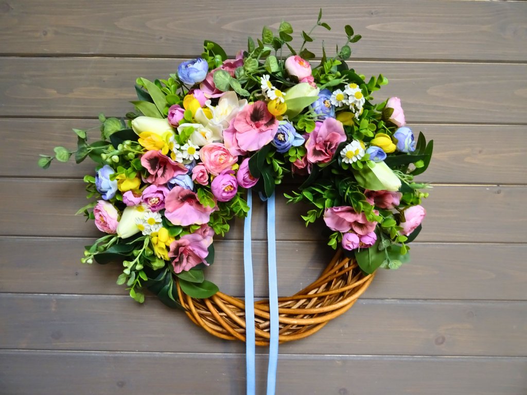 Jarní věnec na dveře zdobený barevnými jarními květy.