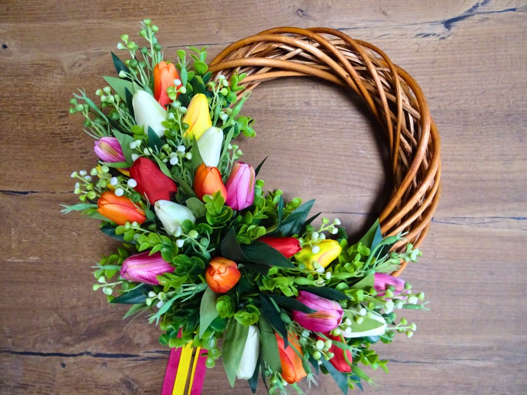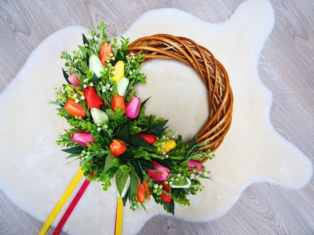 Ručně zdobený proutěný věnec s květy tulipánů a eukalyptem. Rozměry 30 a 35 cm.