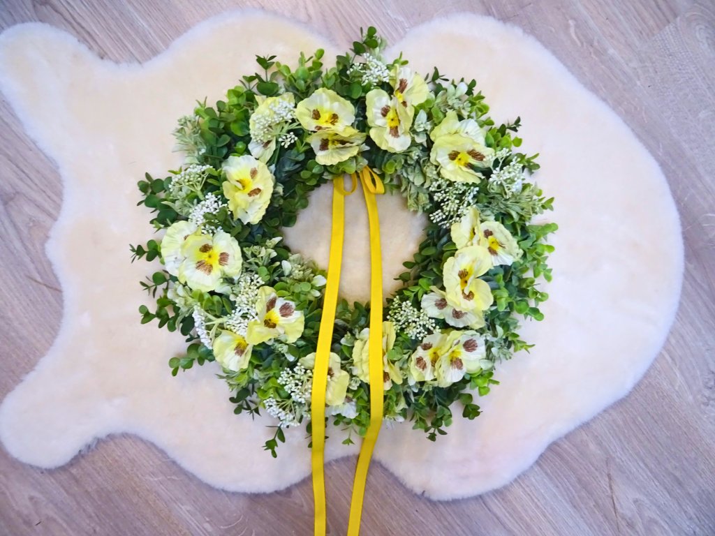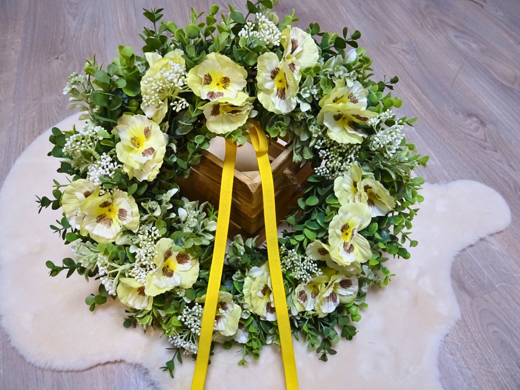 Materiál: umělý eukalyptus, macešky, proutěný věnec.