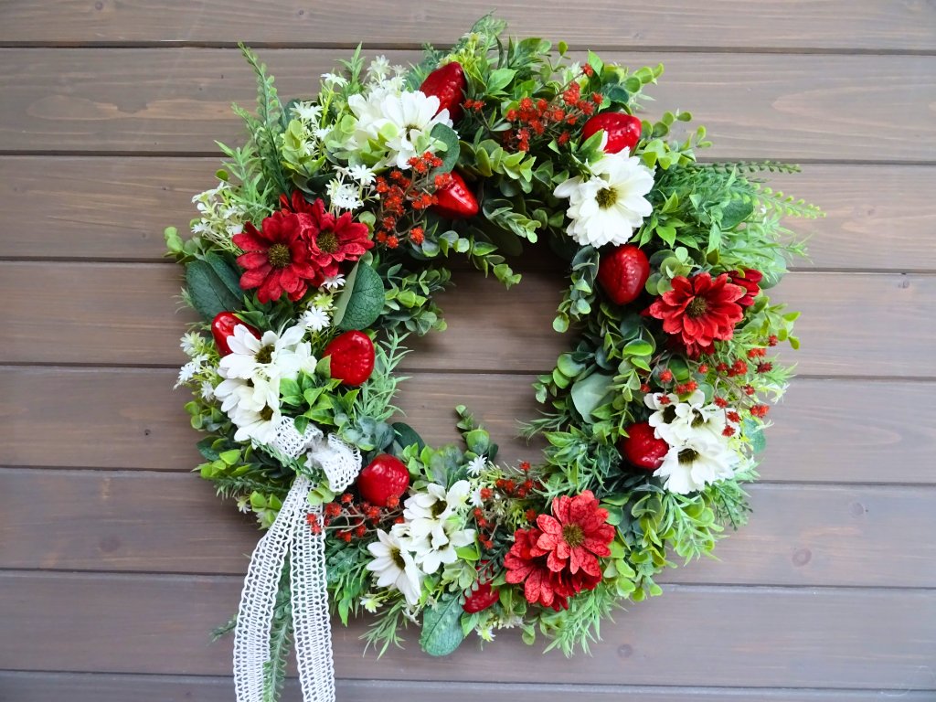 Ručně zdobený proutěný věnec s eukalyptem, rozmarýnem, kopretinami a UMĚLÝMI jahodami, rozměry 35-50 cm.