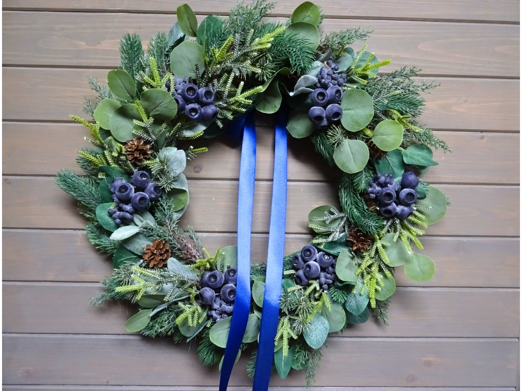 Ručně zdobený věnec zdobený umělým jehličím, šalvějí, eukalyptem a modrými bobulemi, rozměry 35-50 cm.