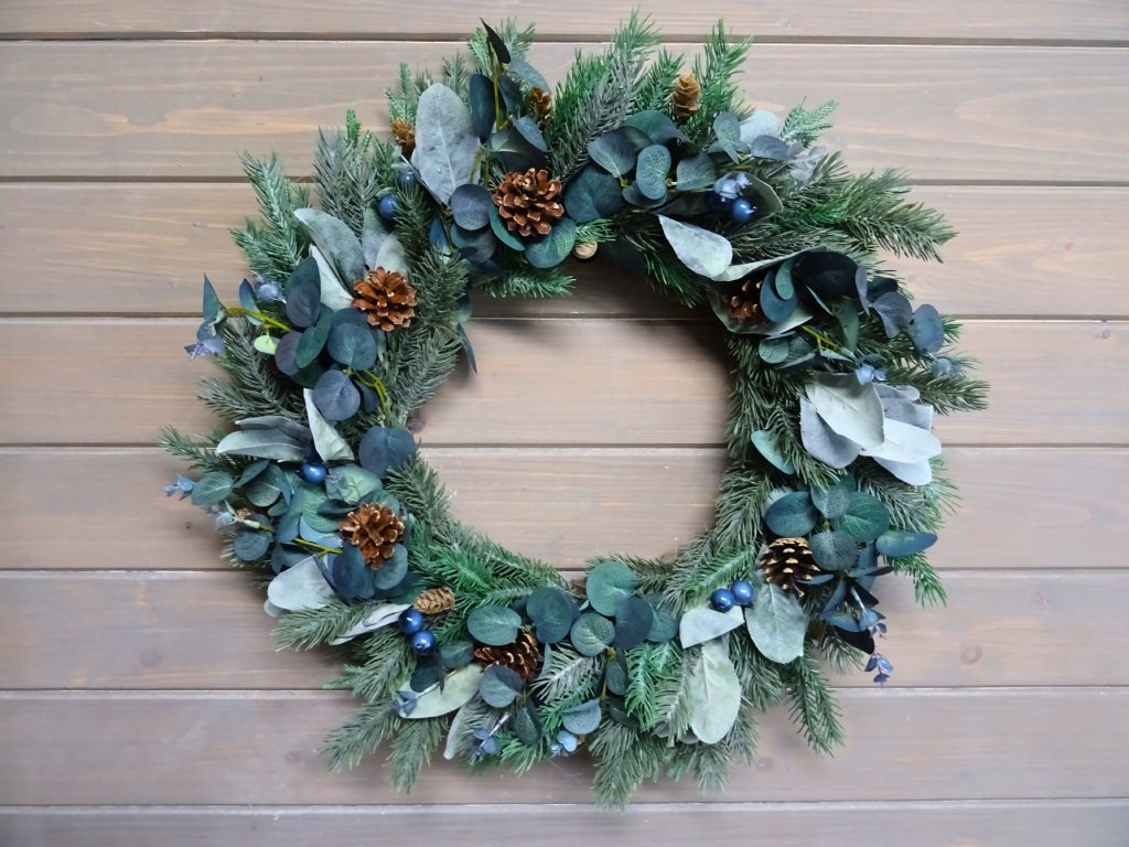 Zimní věnec na dveře s jehličím a eukalyptem v modrých tónech.